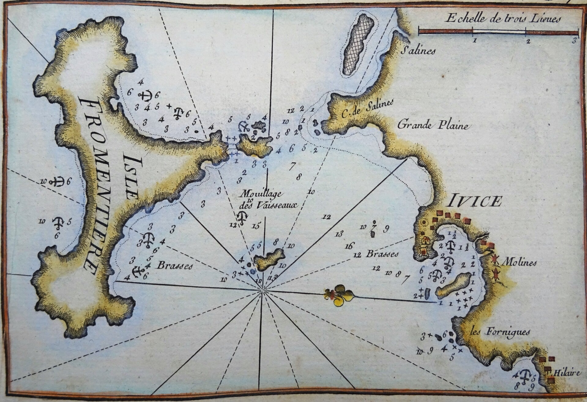 18th century map, by Joseph Roux, showing the city of Ibiza and the island of Formentera.