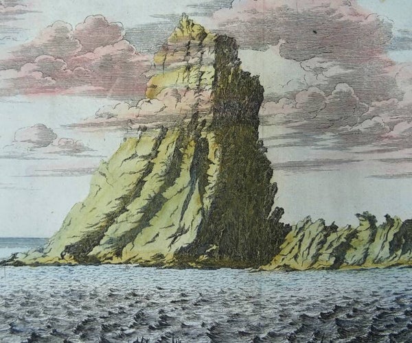 A 17th century copper-engraved view of the island Tenerife, from a 1671 English edition (by Ogilby) of Olfert Dapper's ´Naukeurige Beschrijvinge der Afrikaensche Gewesten´, commonly known as the Description of Africa. The view is not very accurate, most likely the artist based his drawing on the verbal description of the island and perhaps some rudimentary older images.