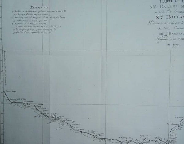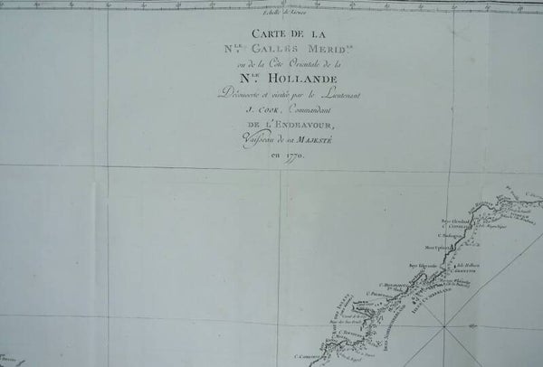 This is the 1774 first French edition of James Cook's first map of New South Wales, Australia. Oriented to the West, the map extends from Cape York, Prince of Wales Island, and the Endeavour Straits to Point Hicks (Victoria). The map is a product of Cook's search for the often speculated upon southern continent or 'Terra Australis,' which scholars from the 16th century on believed, based upon ancient Greek texts, must exist at the base of the world.