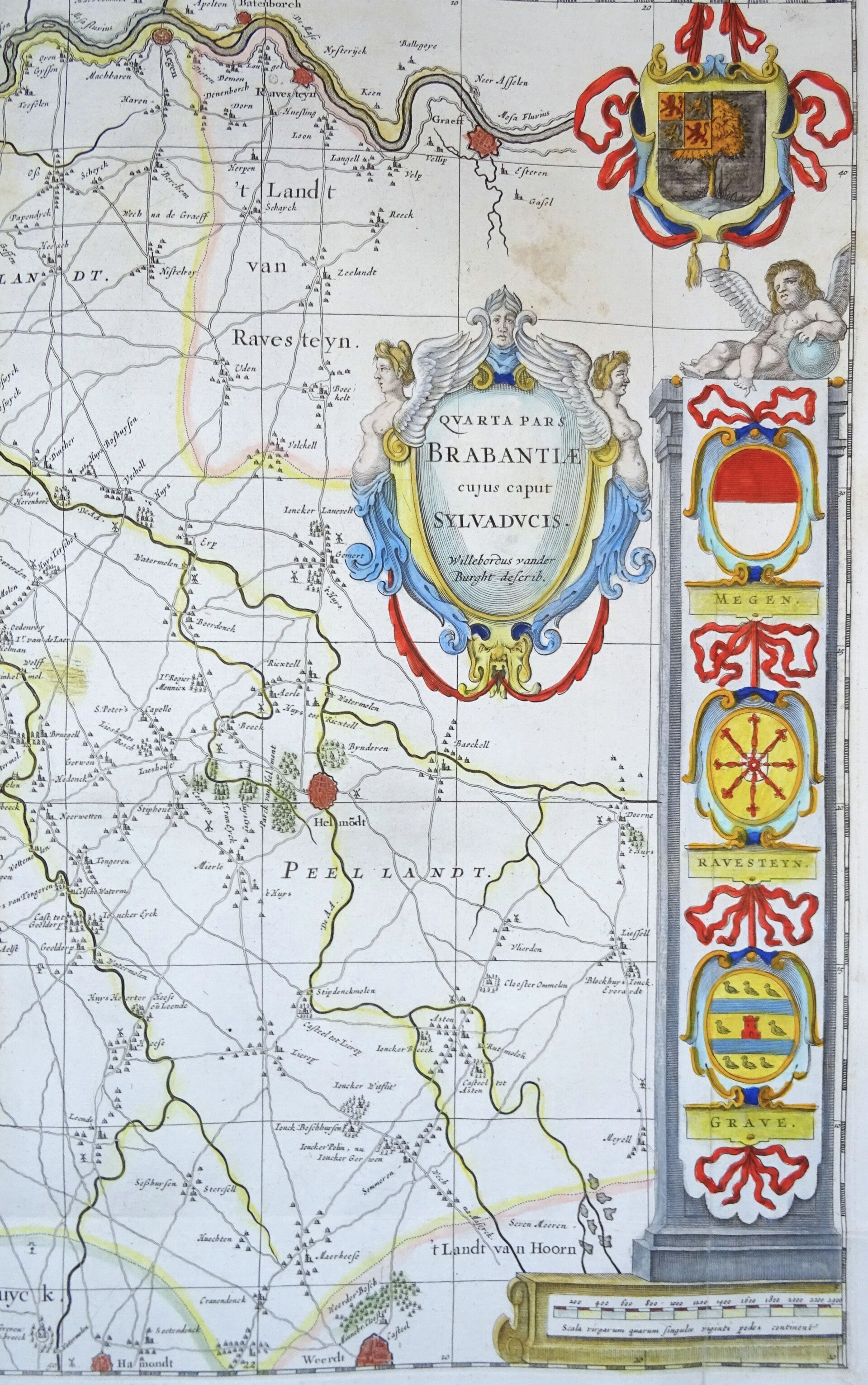 Early 18th-century folio-sized map of eastern North Brabant in the Netherlands. Beautifully decorated with a title cartouche and coats of arms on the sides. The map shows eastern North Brabant with Eindhoven in the center. The coat of arms of Brabant is in the upper left; the coat of arms of 's-Hertogenbosch is in the upper right. On either side of the map is a column crowned with a putto and standing on a base containing the scale bars. The coats of arms of the most important towns are displayed within the columns.