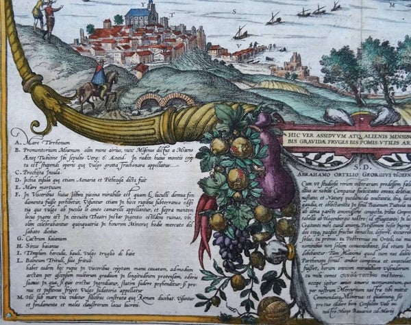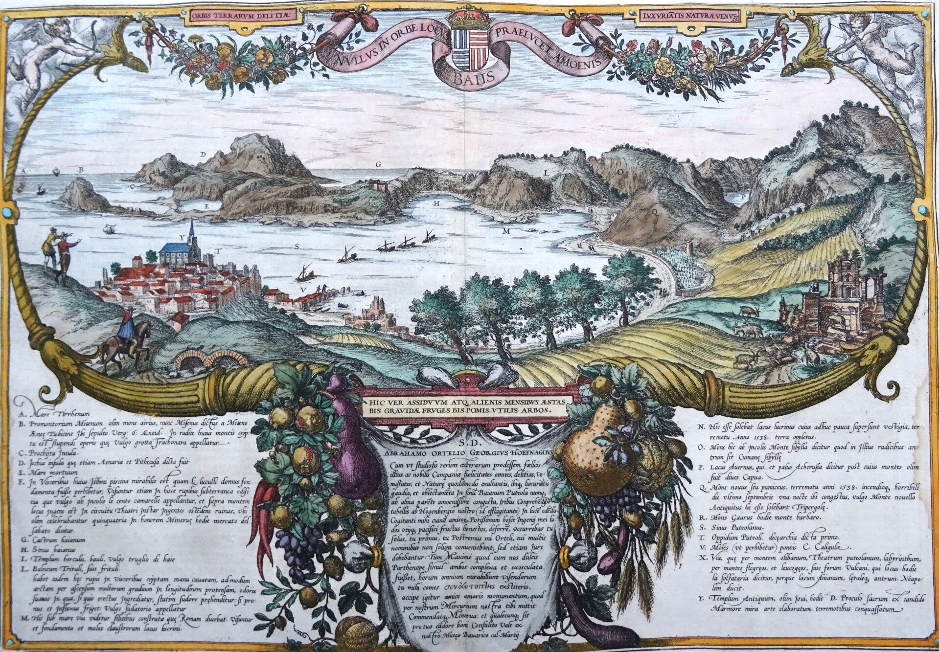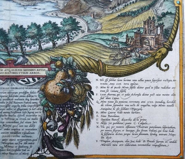 "Their travels led Georg Hoefnagel and his companion Ortelius (left, on a knoll) to the Gulf of Baia. Complementing the two engravings in volume II, this view is seen from an elevated point in the east and shows Pozzuoli in the foreground (T) together with the islands of Procida (C) and Ischia (D), the castle of Baia (F-G), the mountain with the Grotto of the Camaean Sybil (O), Lake Averno (P) and the temple of Jupiter (Y), flanked by curving cornucopias overflowing with the abundant gifts of nature in this climatically blessed region. The accompanying texts draw upon a knowledge of the literature of classical antiquity, for instance the remark that Cape Misenum (B) is named after Misenus, Aeneas's trumpeter, who is buried there, or the reference to natural histories, such as that of the Trituli sweat baths (L). This plate is unique in the city atlas because of its colourfulness. At the same time it is an important example of creative talents of the artist, Hoefnagel, who, in collaboration with his travelling companion Ortelius, who is again lavishly praised in the inset text (centre), augments his observations of nature with his knowledge of the classics and natural history". (Taschen)