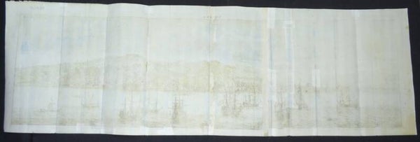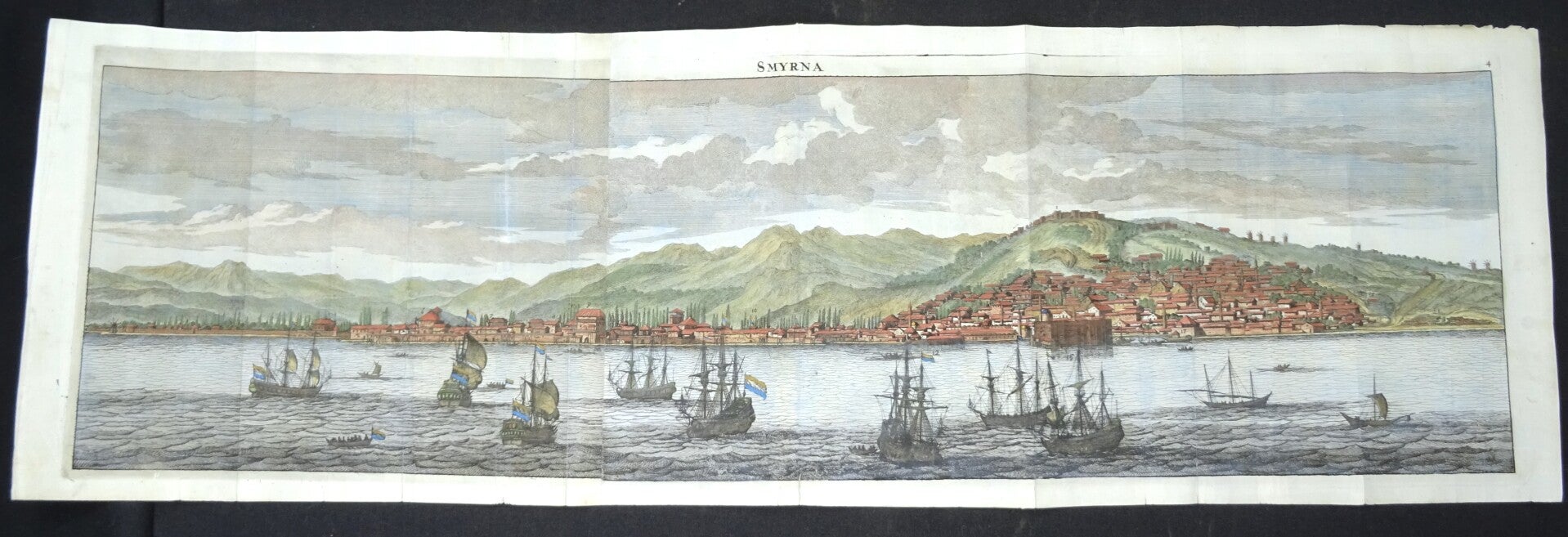 Large (103,5cm wide) 17th century copper engraved panoramic view of Smyrna, modern day Izmir in Turkey. This incredible panoramic view gives a spectacular image of one of the important cities in the Ottoman Empire.