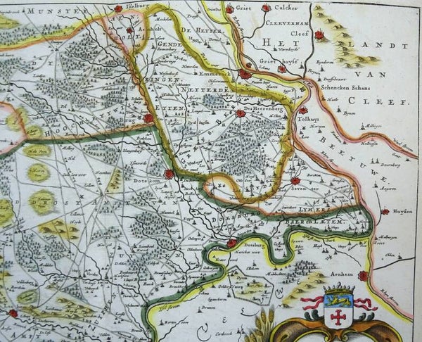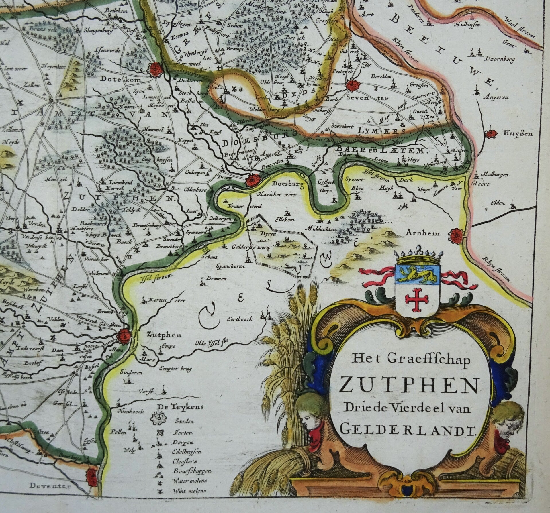 Published by Jacob van Biesen in Arnhem in 1654. Gelderland cartographer Nicolaas Geelkercken was responsible for the maps and special city plans with profile views. His city plans were later used by Joan Blaeu and Johannes Janssonius for their City Books.