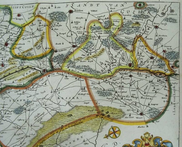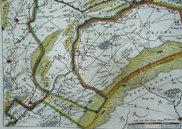 Highly detailed 17th-century map of North Limburg and eastern North Brabant. North is in the lower left corner, Venlo and the Peel region are in the center of the map, Roermond is on the right, and the area around Boxmeer is on the left.