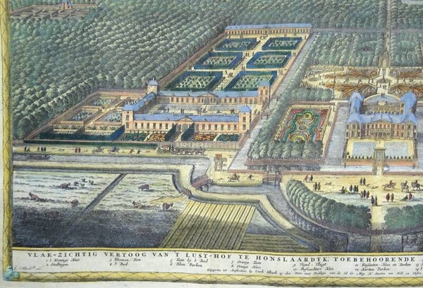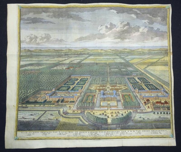Very rare large folio sized bird´s eye view of the country estate Huis Honselaarsdijk, the palace of Frederik Hendrik of Orange-Nassau. On the background the dunes with the towns of Monster and ´s-Gravenzande and the North Sea.
