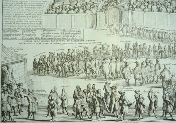Fascinating series of scenes, illustrating the activities and principal members of the Scottish Parliament. Remarkable detail, with over 30 individuals and groups named. Very decorative.