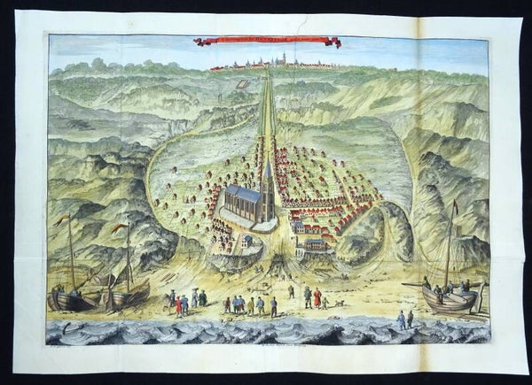 Very large and very beautifully engraved 18th century view of Scheveningen, with The Hague in the background, as it was in the 18th century. We see the village from the sea. In the foreground fishermen, in the middle ground the village with the church, in the background the Scheveningse Weg and The Hague.