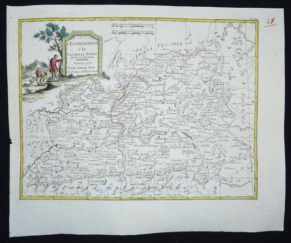Copperplate map by the Italian cartographer Antonio Zatta. It comes from the work, “Atlante novissimo, ilustrato e accresciuto”, published in four volumes between 1775 and 1785 in Venice with some 240 maps engraved by G. Pitteri, G.V. Pasquali, and G. Zuliani. It shows Extremadura and New Castile (Spain) and their bordering areas: Portugal, Old Castile, Aragon, Valencia, and Andalusia. A highly ornate and decorative map, it has a beautiful vignette in the upper left corner with a rural scene of a shepherd with his flock, pointing to a large stone plaque on which we can read the title of the engraving, the name of the publisher, the date, and the city where it was published. To its right, we can see the scale, also expressed in leagues of Spain and Italy. Frame with meridians and parallels marked to 1°. Cardinal points indicated. Relief represented by shaded contour lines, with the main geographical features and numerous place names. Planimetry with cities represented by small circles or stars and administrative boundaries by colored lines. Hydrography depicts the main river network, with the names of the most important rivers. Text in Italian and Spanish.