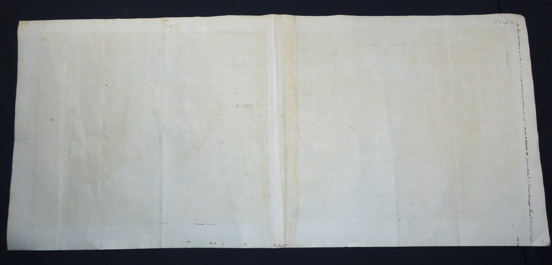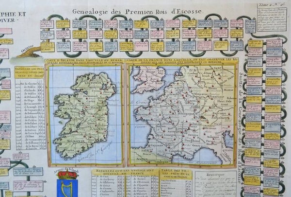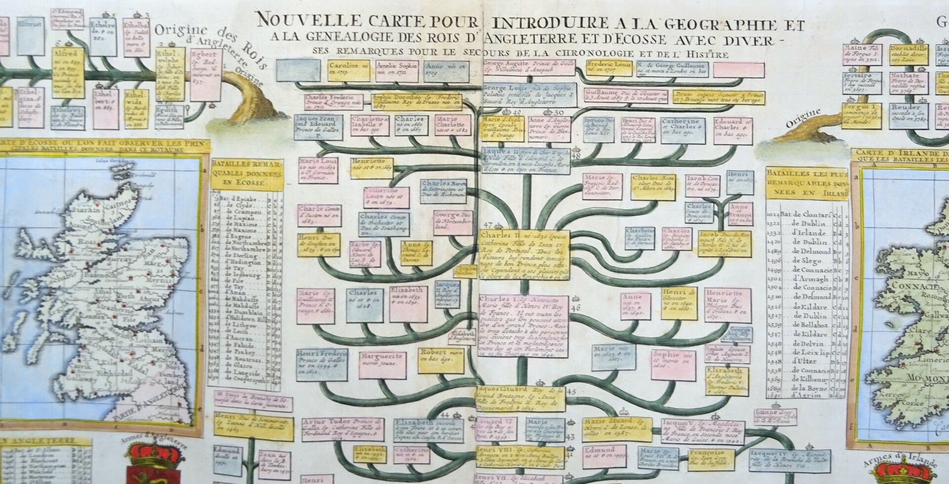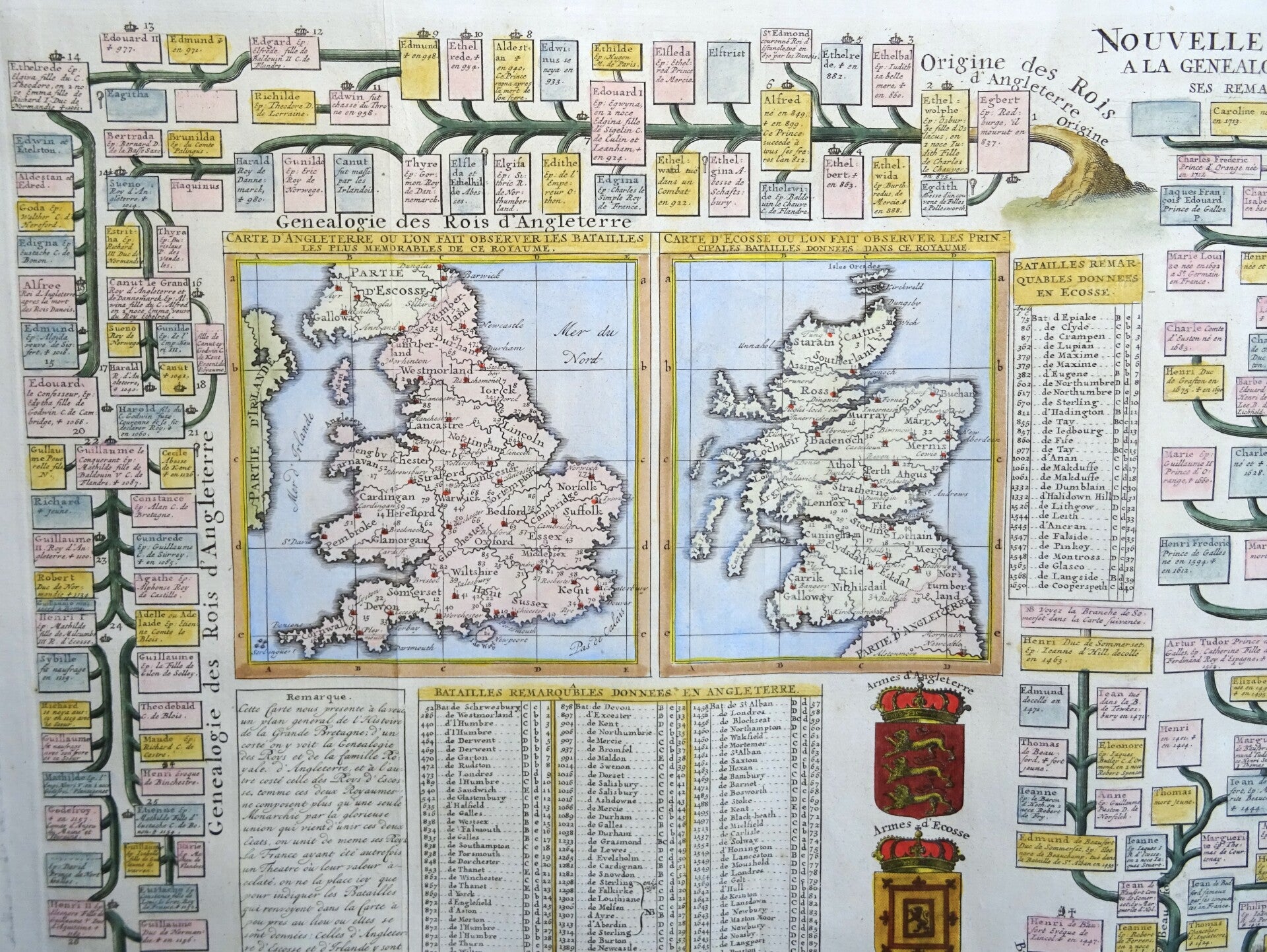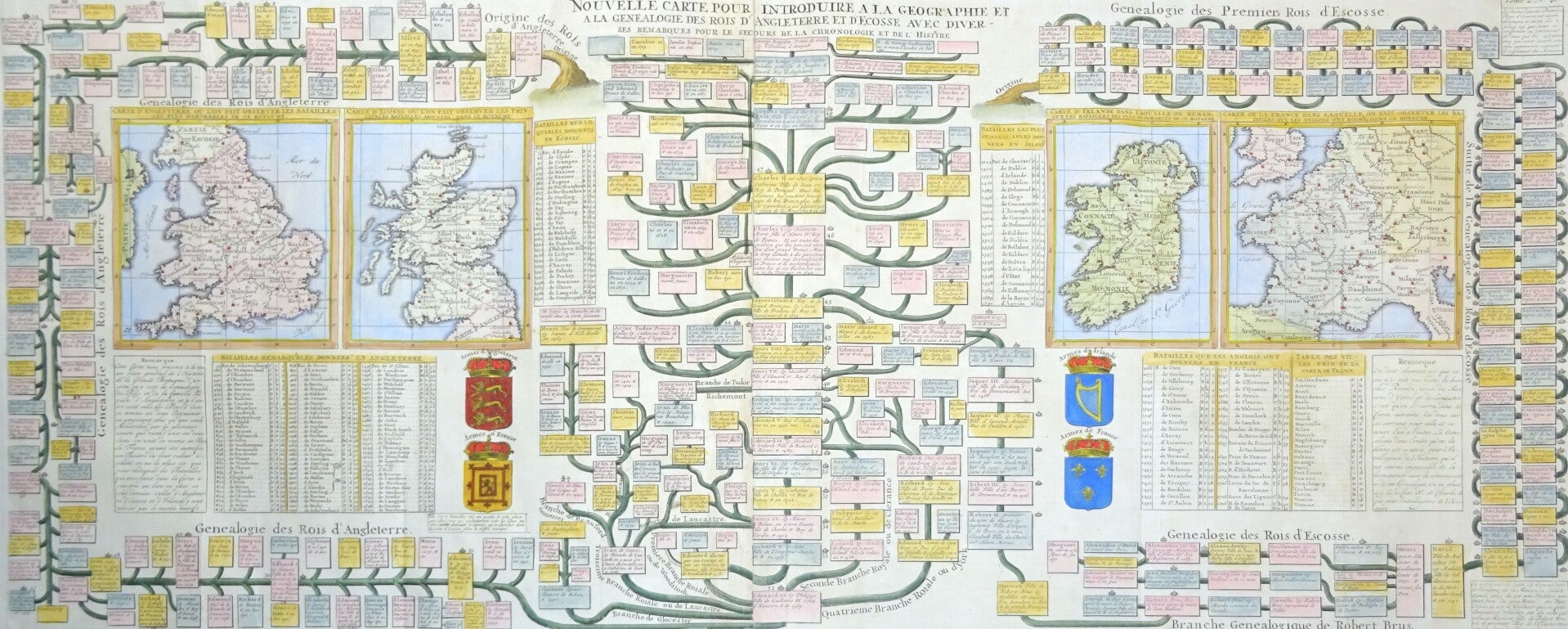 Very large copper engraving (almost 1 meter wide) with four maps and a striking family tree for the Royal Families of Britain, Scotland, and France. Includes 4 coats of arms.