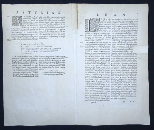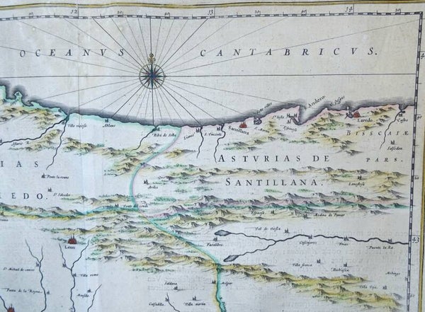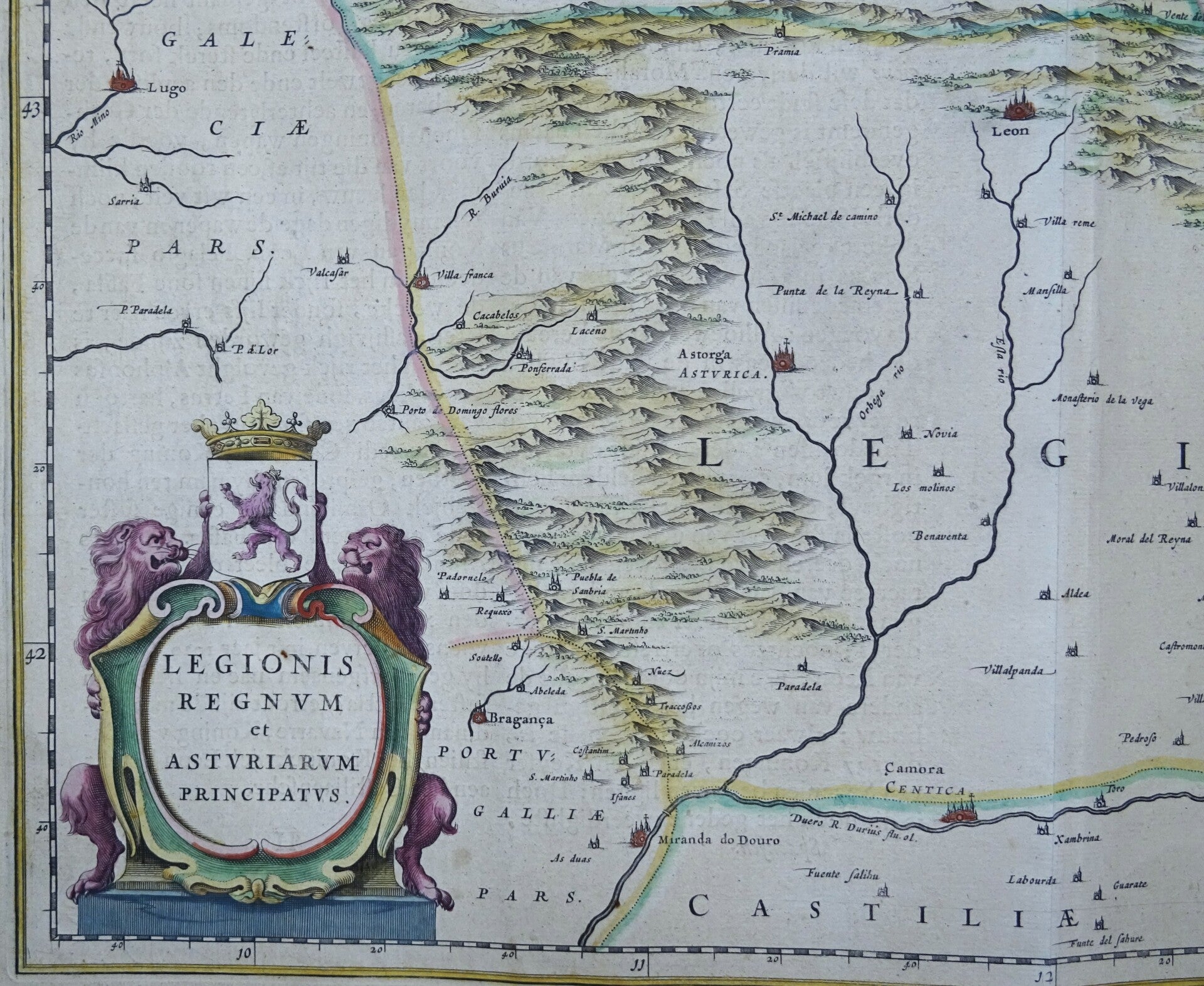 Decorative map of the Northwest Coastal region of Spain, bounded by Rivadeao, Lugo and Camora, Simancas, Valladolid, Palencia, Lerma, Burdos Laredo and Santillana and centered on Astorga, Leon, Oviedo, Aviles and the border of Galicia. Consists primarily of Austuria, Leon and Oviedo, with compass rose and two decorative cartouches. A fine example from a Dutch edition of Blaeu's Atlas Novus.