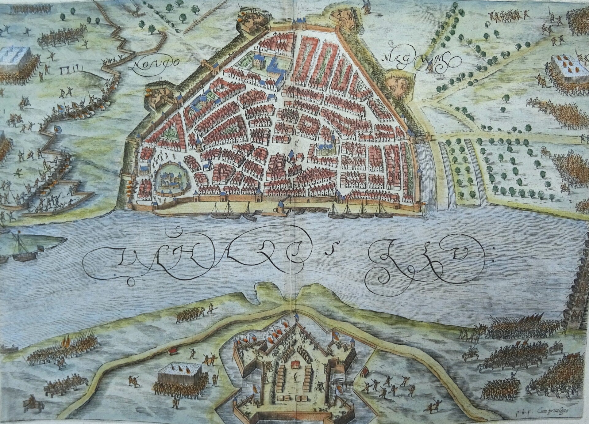 Map in bird´s eye perspective of the Siege of Nijmegen (under Spanish control) in 1590-1591 by the Dutch troops of Prince Maurice (Maurits). The siege lasted from May 1590 until October 1591. The map shows Nijmegen with the Waal River and Fort Knotsenburg from which Maurice ordered the city to be shelled.