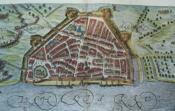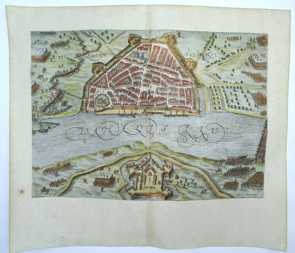 Published in 1610 in Leiden (Netherlands) by J.J. Orlers in ´Den Nassauschen Lauren-Crans: Beschrijvinghe ende af-beeldinge van alle de victorien ... die Godt Almachtich de ... Staten der Vereenichde Nederlanden verleent heeft, deur het wijs ende clouck beleyt des Hooch-ghebooren Fursts Maurits van Nassau´