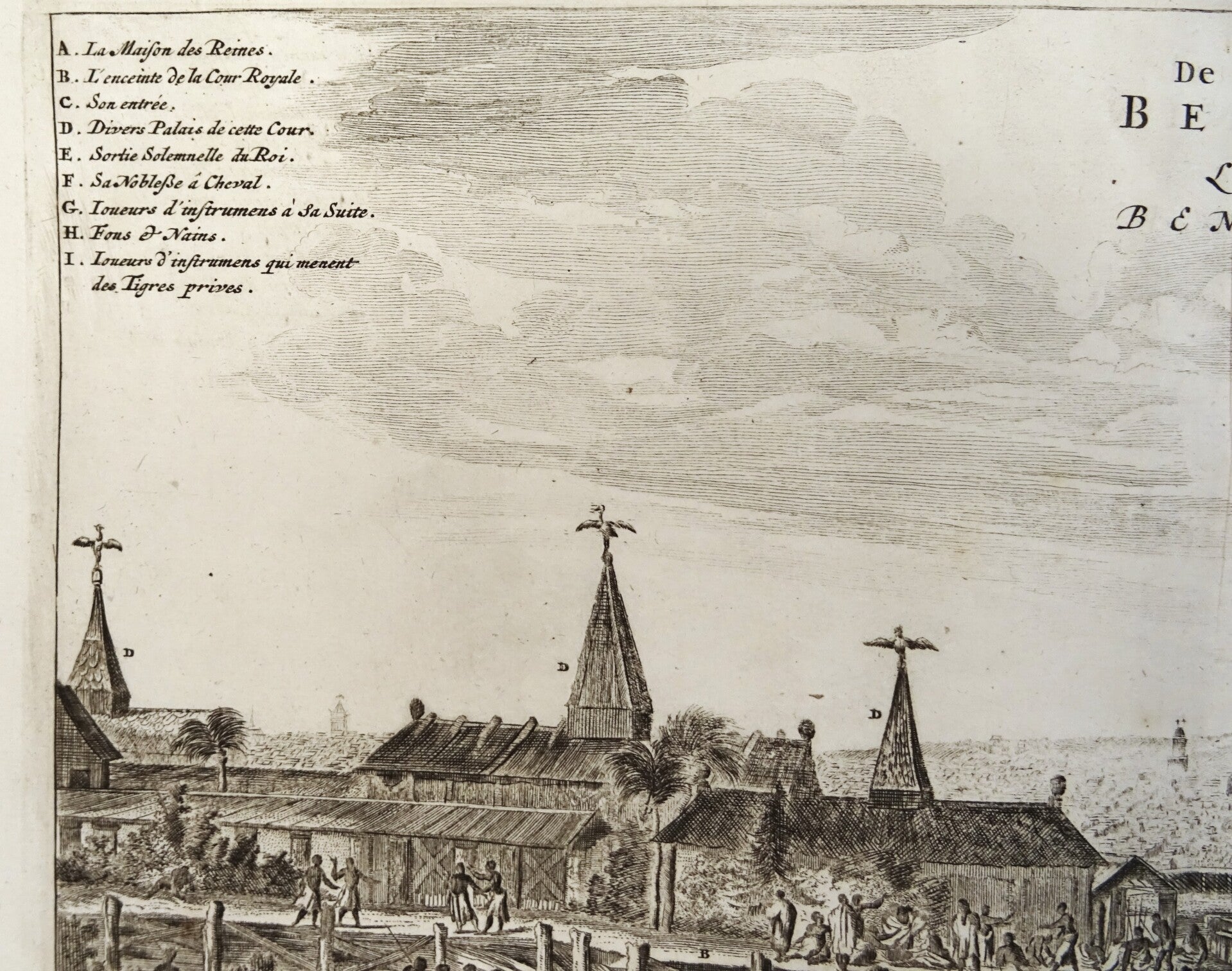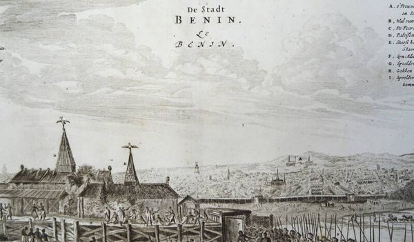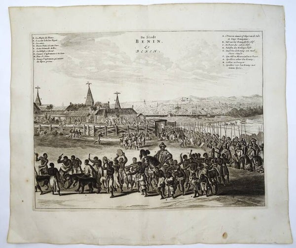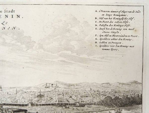17th century copper engraved antique bird's-eye view of the Nigerian city of Benin in southern Nigeria. According to the key, which is printed in both French and Dutch, A denotes the queen's residence. B represents the wall surrounding the royal grounds, and C marks the entrance. The structures marked D are diverse palace buildings. The procession denoted by the letter F (should be E) suggests the "solemn depature of the king." The figure marked E (should be F) represents "his royalty on a horse." G denotes musicians playing for the king; H corresponds with "fools and dwarfs;" and the figures marked I tend to the king's tigers.