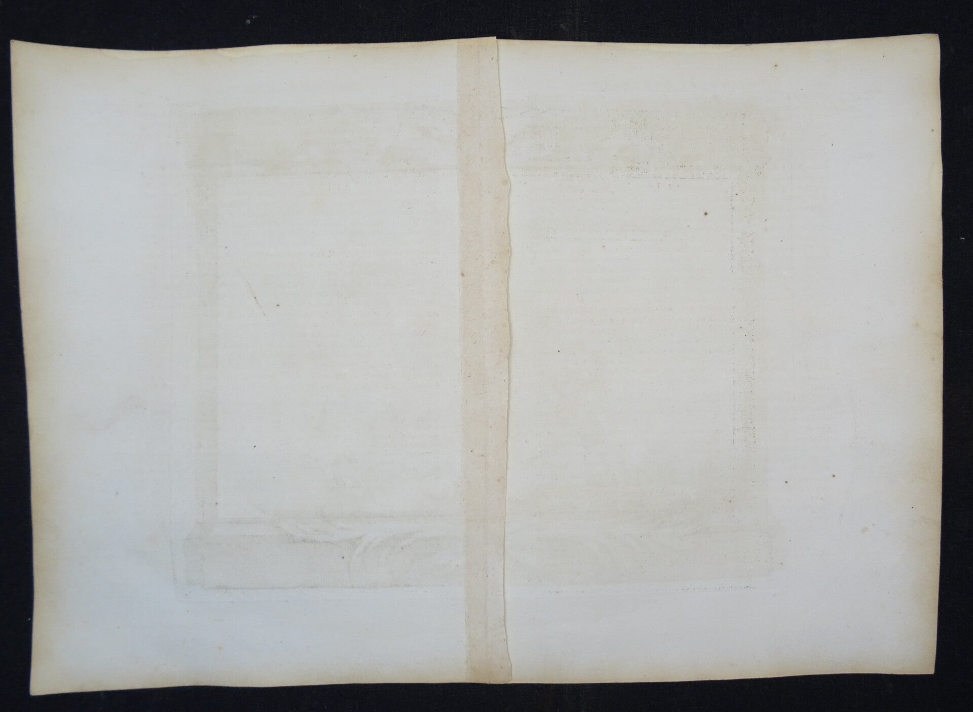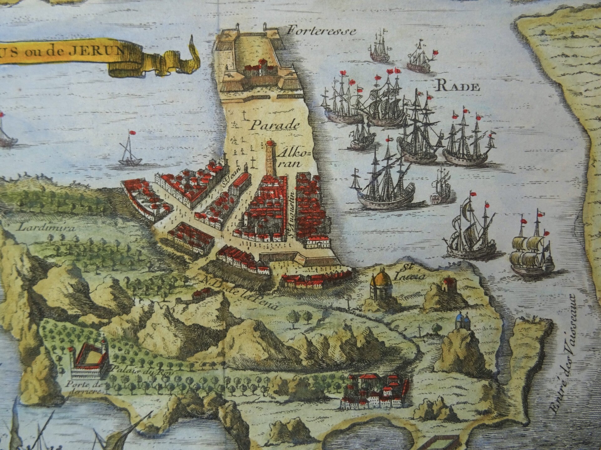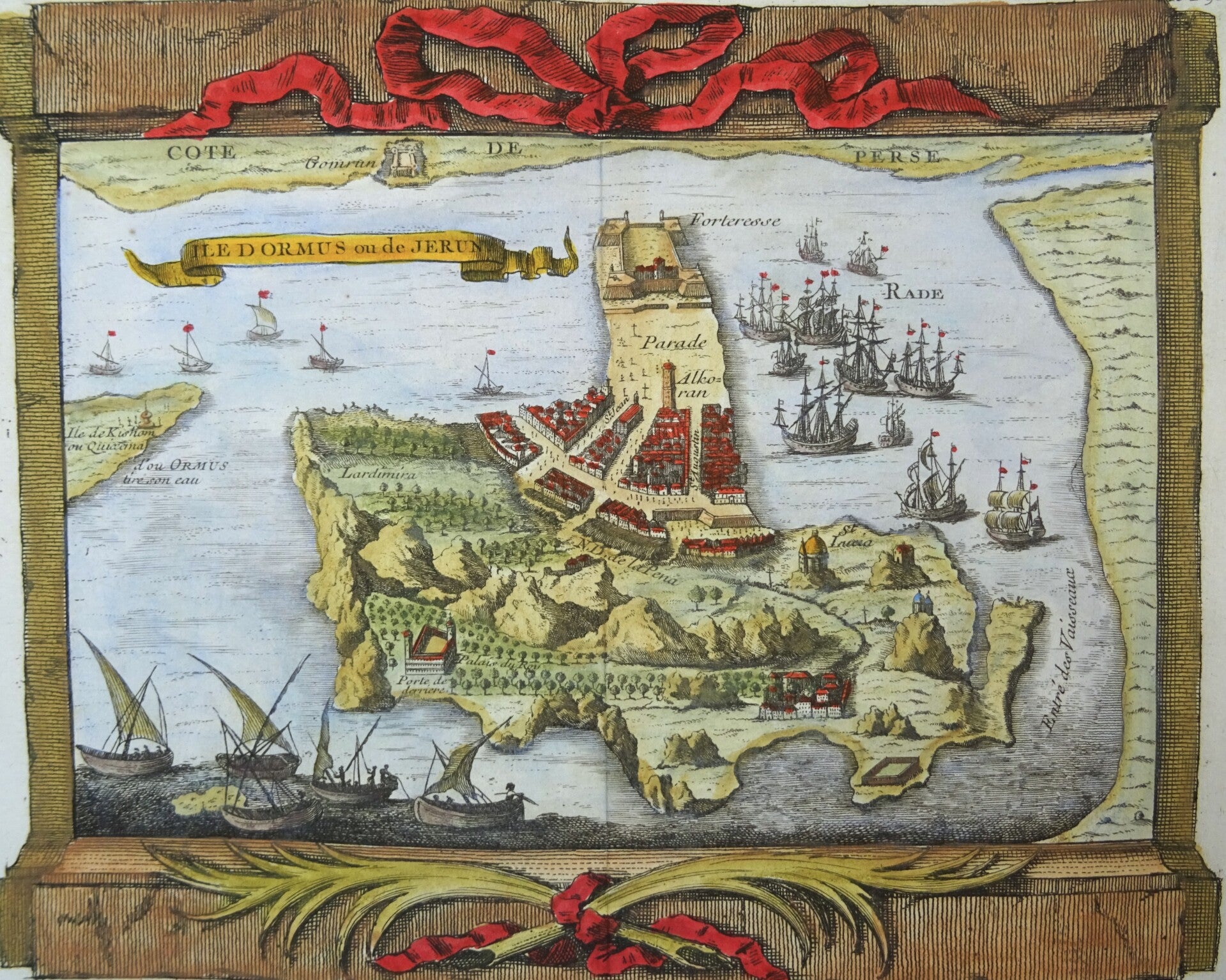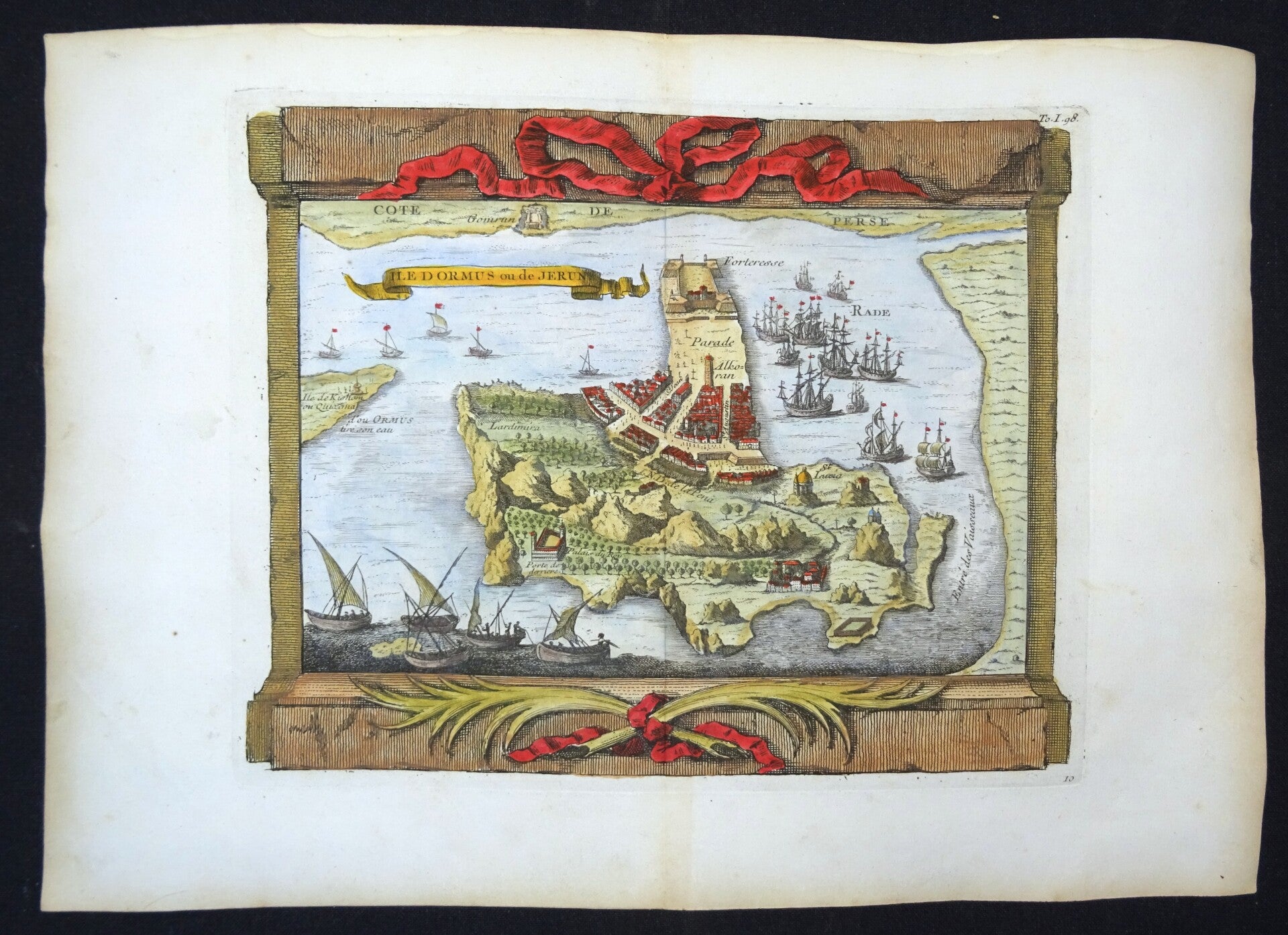 18th-century copperplate engraving of a map of the island of Hormuz in the Persian Gulf, set in a decorative printed frame. Made by J.N. Bellin. Published in Histoire Generale des Voyages, Paris, 1746.