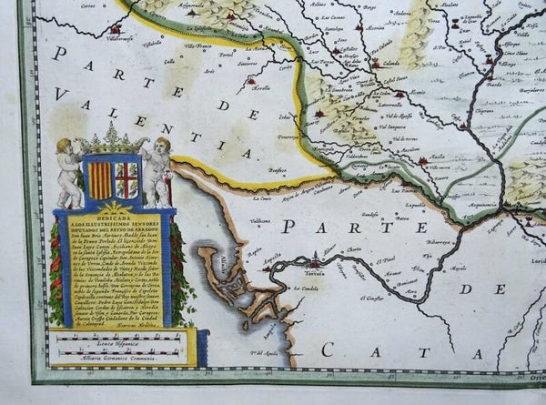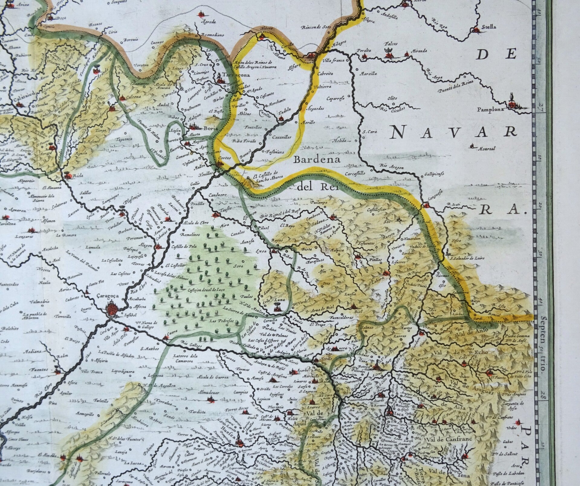 A very beautiful and decorative copy, in very good condition, of Janssonius' map of Aragon, based on the cartography of Juan Bautista Labana (a Portuguese man, which explains the spelling of Zaragoza, for example, as Çaragoça).
