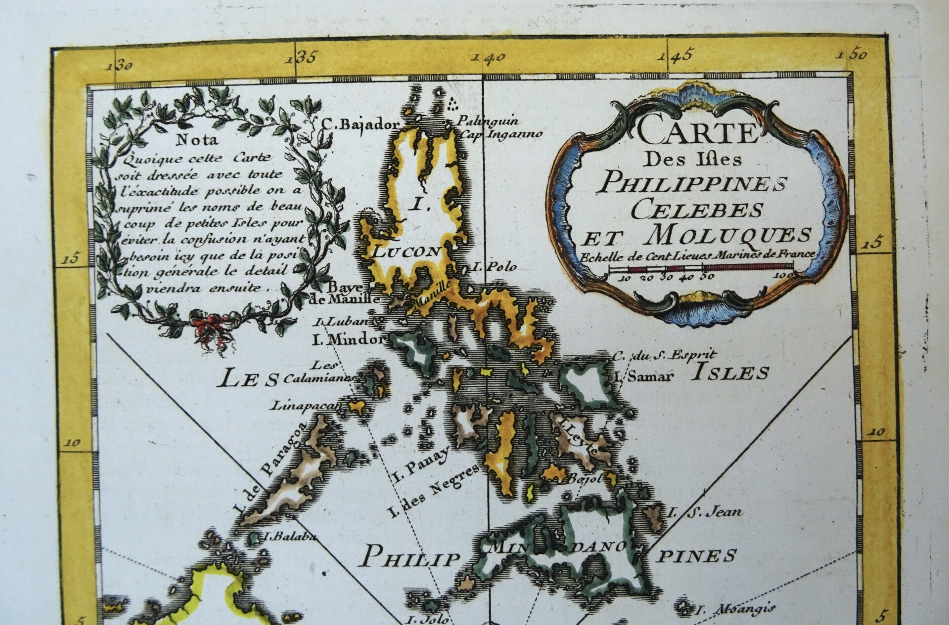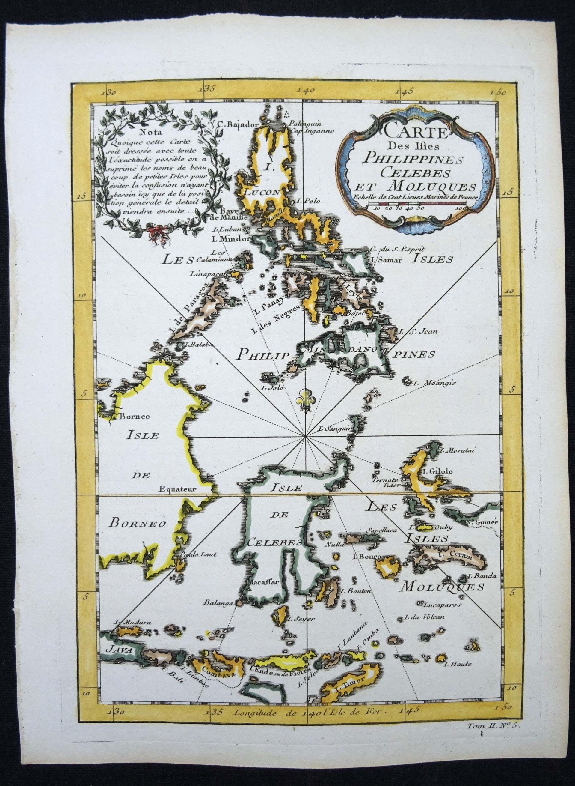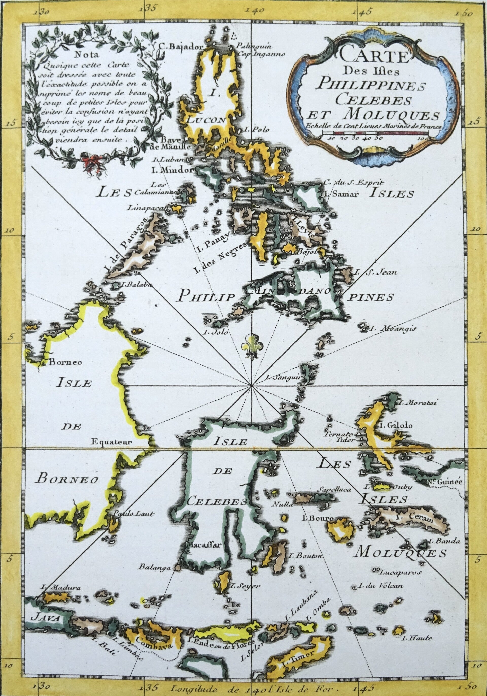 18th-century copperplate engraving of a map of the islands of the Philippines and the eastern part of Indonesia (Moluccas, Kalimantan, Sulawesi, Bali. Timor….).