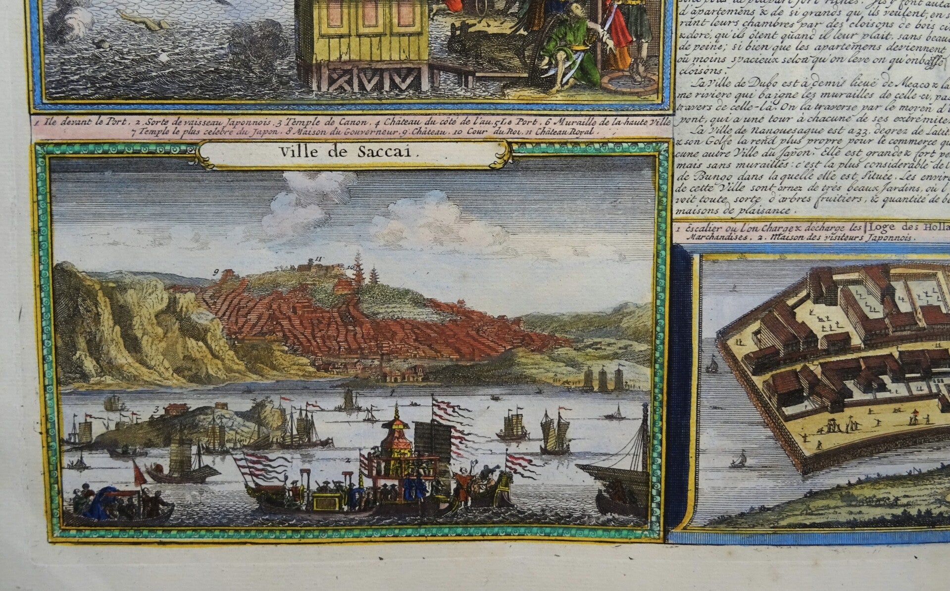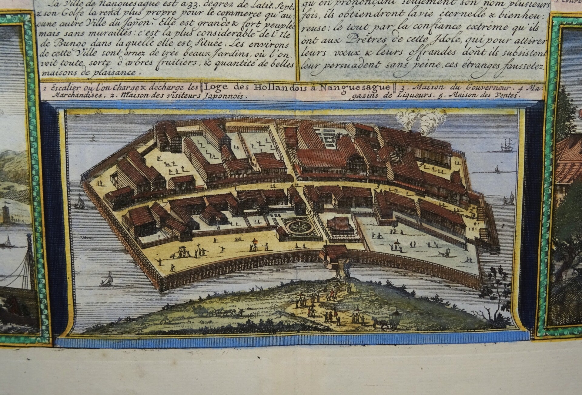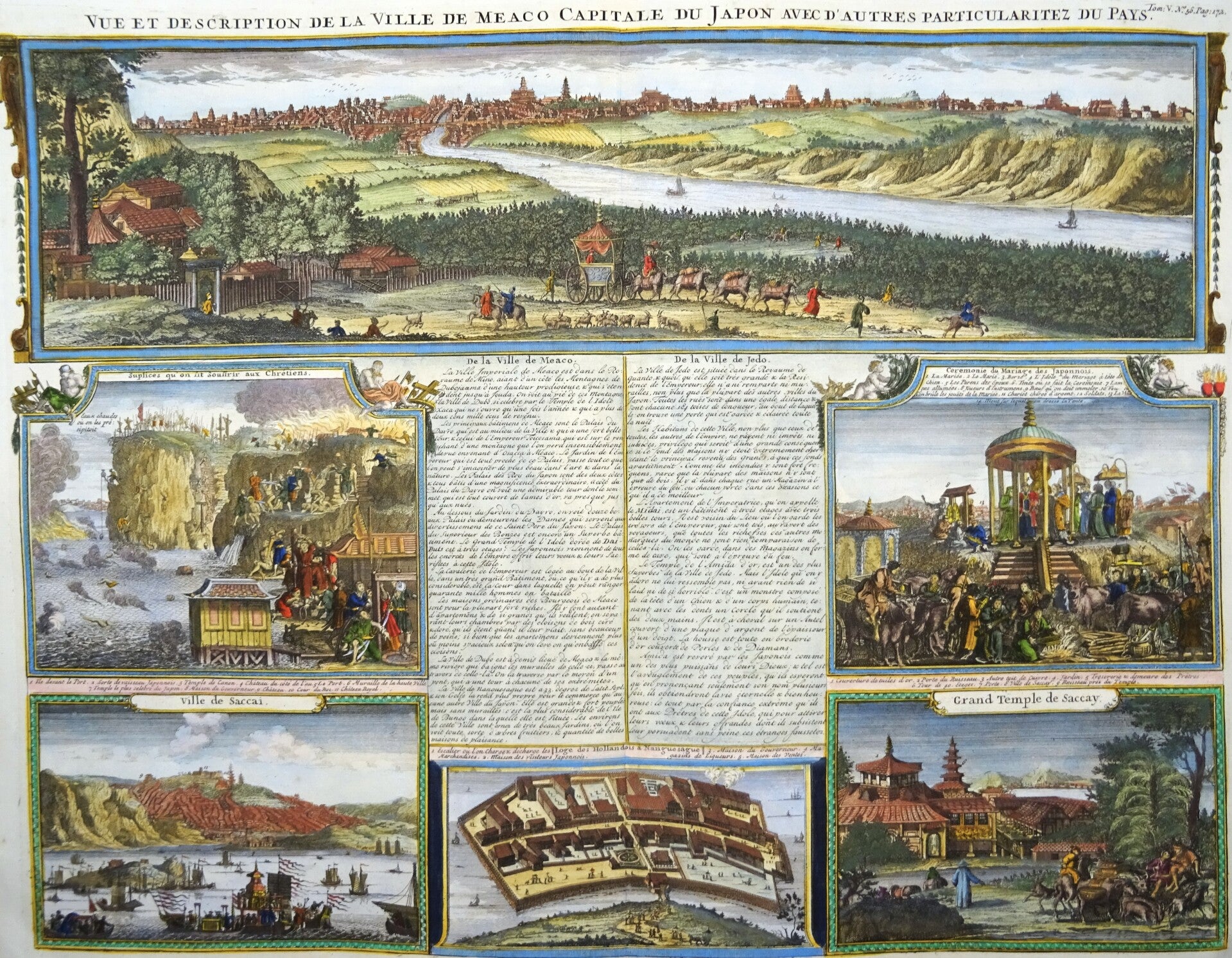 Beautifully engraved and fascinating folio sheet with five views and one plan surrounding a central panel of French text describing Meaco (modern day Kyoto, the home of the Dairi or Spiritual Emperor) and Yedo (modern day Tokyo, the home of the Koubo or Secular Emperor). The plan depicts the Deshima, an artificial island in the bay of Nagasaki where the VOC (Dutch East India Company) was allowed to trade with the representatives of the Shogun in Edo (Tokyo). On the views we also see Osaka, the temple outside Osaka and a Japanese Wedding. The large panorama on top is of Kyoto.