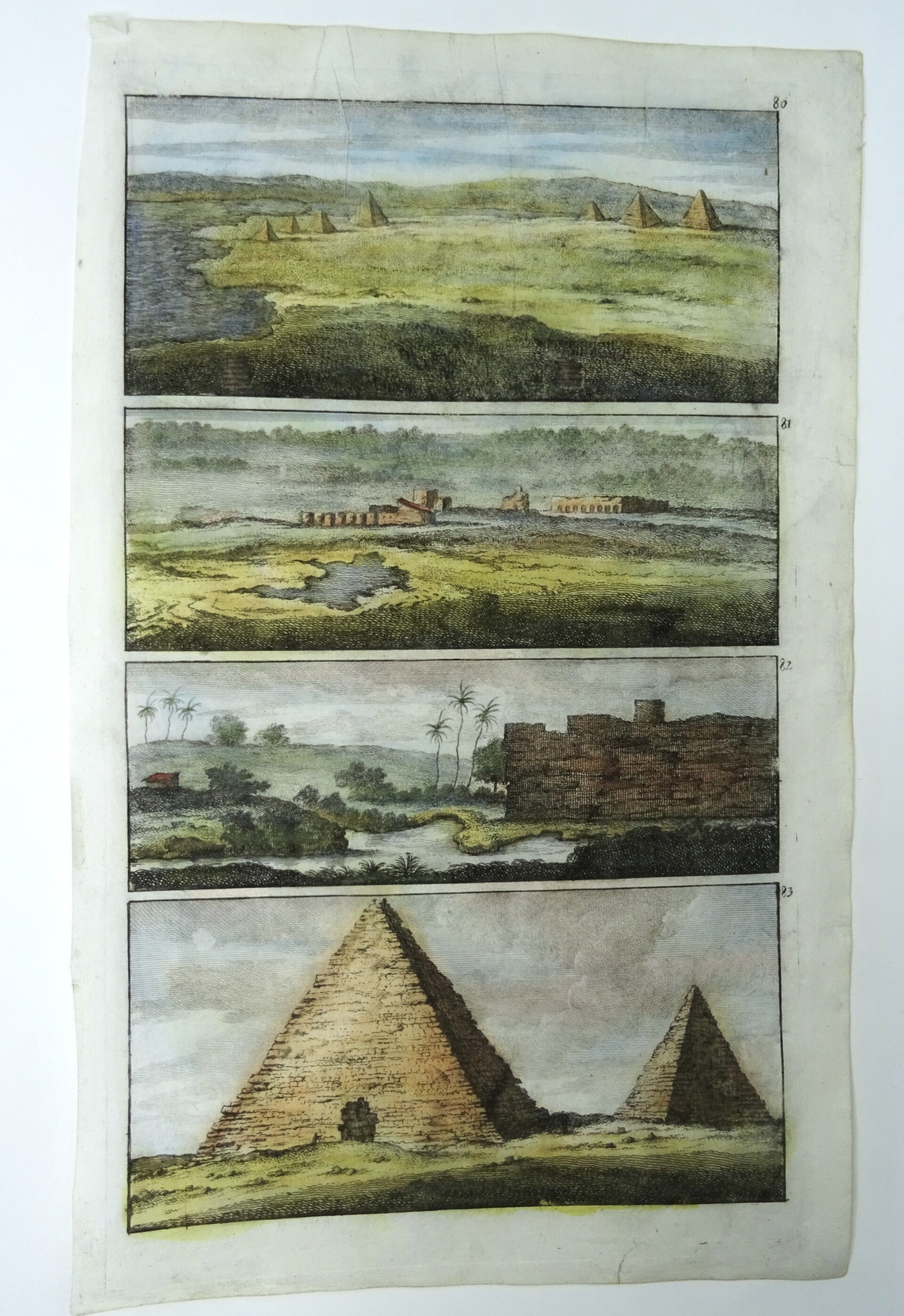 Two large 17th century copper engravings of the outside and the inside (first known engraving of ´tourism´ inside the pyramids!) the pyramids near Cairo.