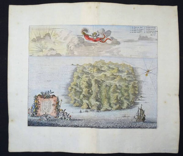 Large copper engraved view of the island of Saint Helena in the Southern Atlantic Ocean between Africa and South America.