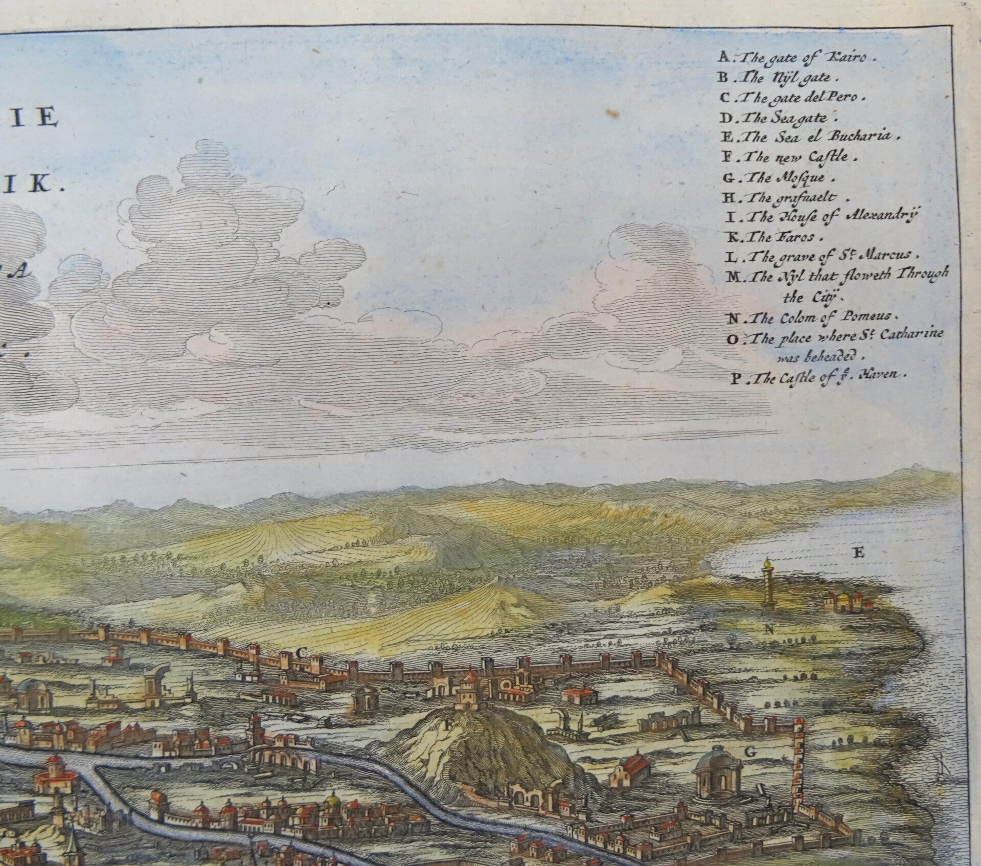 The city is shown from the north, looking across the coast and its harbours, towards the city. Various key structures are shown, accompanied by a lettered key in Dutch and English in the top left and right corners of the plate. Most notable is the famous Pharos, one of the seven ancient wonders, though its inclusion is clearly romantic, as the final part of the lighthouse was removed in AD 1480, the stones being recycled in the construction of the Citadel of Qaitbay.