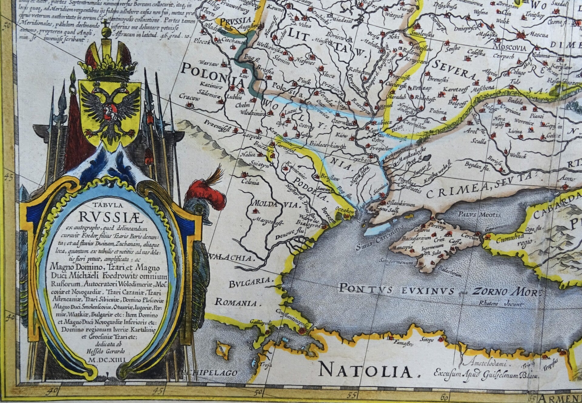 The famous Blaeu map of Russia and Eastern Europe, showing the area between the Baltic Sea, the Polar Sea, the Black Sea and the Caspian Sea. Two inserts (map and view): Moscow and Arkhangelsk.