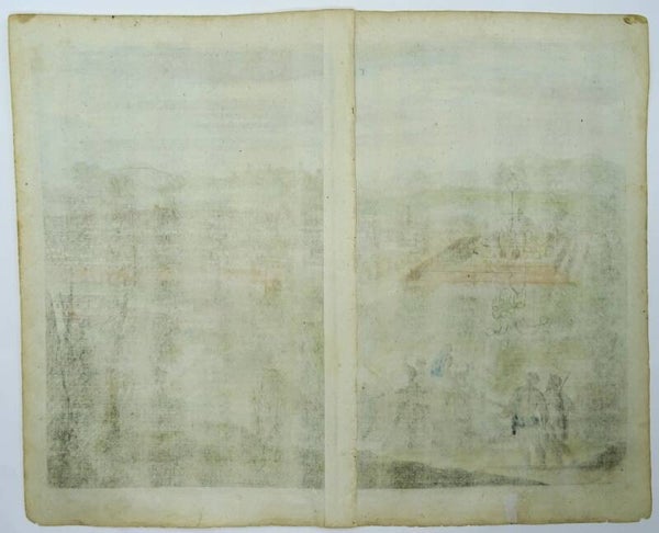 Very fine copperplate engraving of Cusco from the vantage point of a hill overlooking the city. The foreground is filled with people and livestock traveling the road leading to the town. The publication history of this engraving is interesting, as it appeared in both regular and reverse images in various Dutch editions of Montanus' De Nieuwe en Onbekende Weereld published by Jacob de Meurs in 1671. It is unclear which edition was the first - the edition with the large temple and bridge on the left side, or the edition with the temple and bridge on the right. The edition with the temple and bridge on the right was acquired by Ogilby for his English translation of Montanus' work published later the same year (1671), whereas the edition with the temple and bridge on the left was acquired by Olfert Dapper and published in the German translation, Die Unbekante Neue Welt, oder Beschreibung des Welt-Teils Amerika, in 1673. This is the only plate we are aware of that exists in both regular and reverse editions within Montanus' work.