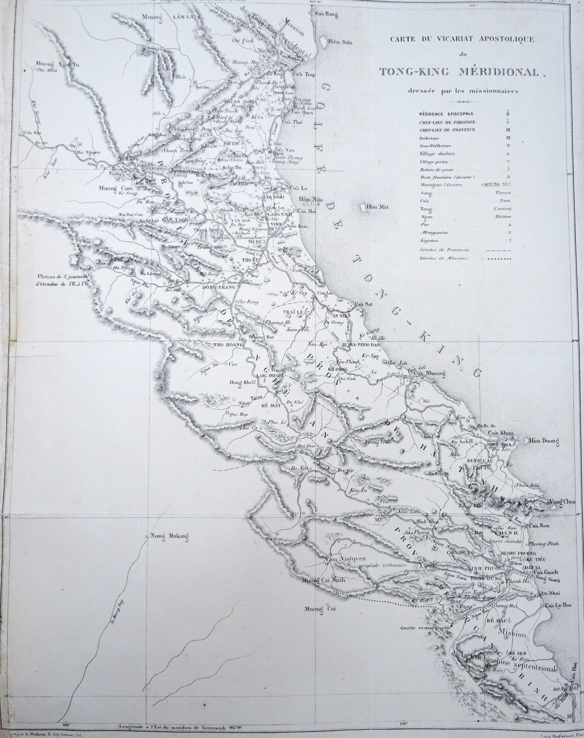 Rare and highly detailed uncommon original lithographic map of the Apostolic Vicariate of Southern Tong-King. An apostolic vicariate is a territorial jurisdiction of the Catholic Church, similar to a diocese, but established in regions where the Church is not yet fully developed.