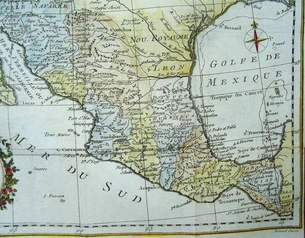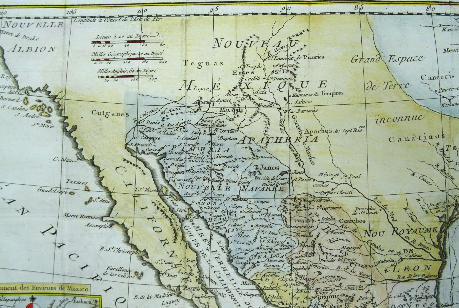 To the north, “Nouvelle Albion” appears along the Pacific Coast—a holdover from Francis Drake’s 1579 voyage—while the Baja Peninsula is depicted with relative accuracy, showing La Paz, Loreto, and St. Lucie. In New Mexico and Arizona, we see references to early mission and presidio towns, including Santa Fe, El Paso, and Janos, as well as indigenous nations such as the Apaches, Navajos, and Teguas. A large region east of the Rio Grande is labeled Nouv. Royaume de Leon, and east of that lies a relatively underexplored Texas interior, marked with sparse settlements like Nacogdoches and San Antonio but filled with named tribes such as the Canecies and Cadodiuas.