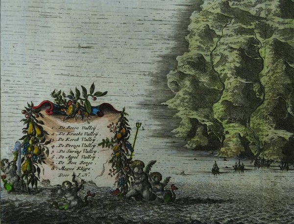 It shows the entirety of the island, illustrating it´s topography and rivers. Eight locations are numerically identified, with an index in Dutch in the lower left corner and an English index in the upper right. Six of the eight identified locations correspond to valleys most likely associated with the rivers.