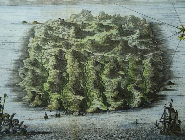 Large copper engraved view of the island of Saint Helena in the Southern Atlantic Ocean between Africa and South America.