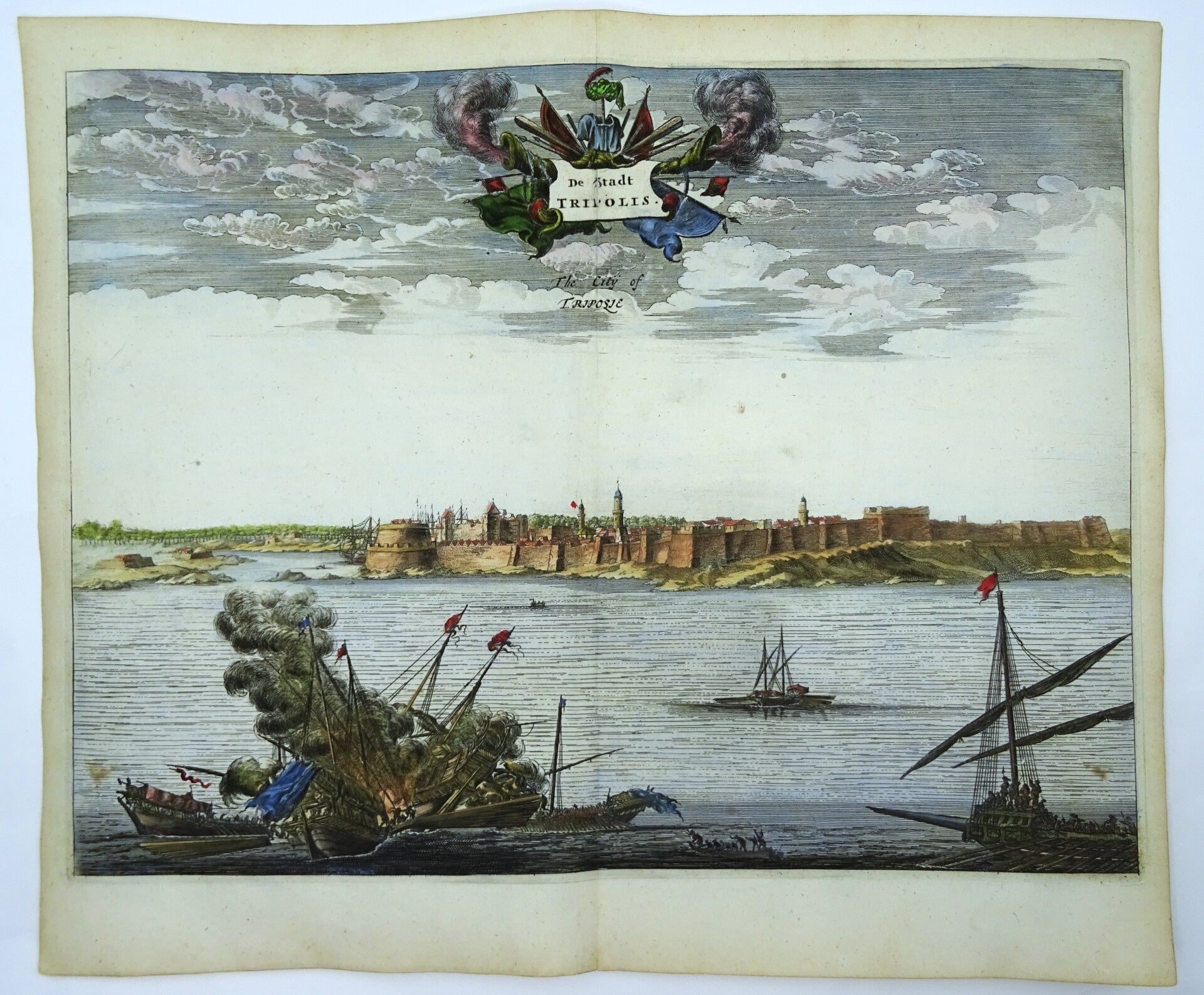 Large copper engraved view of the city of Tripoli in Libya from the water with multiple ships in a sea battle on the foreground.