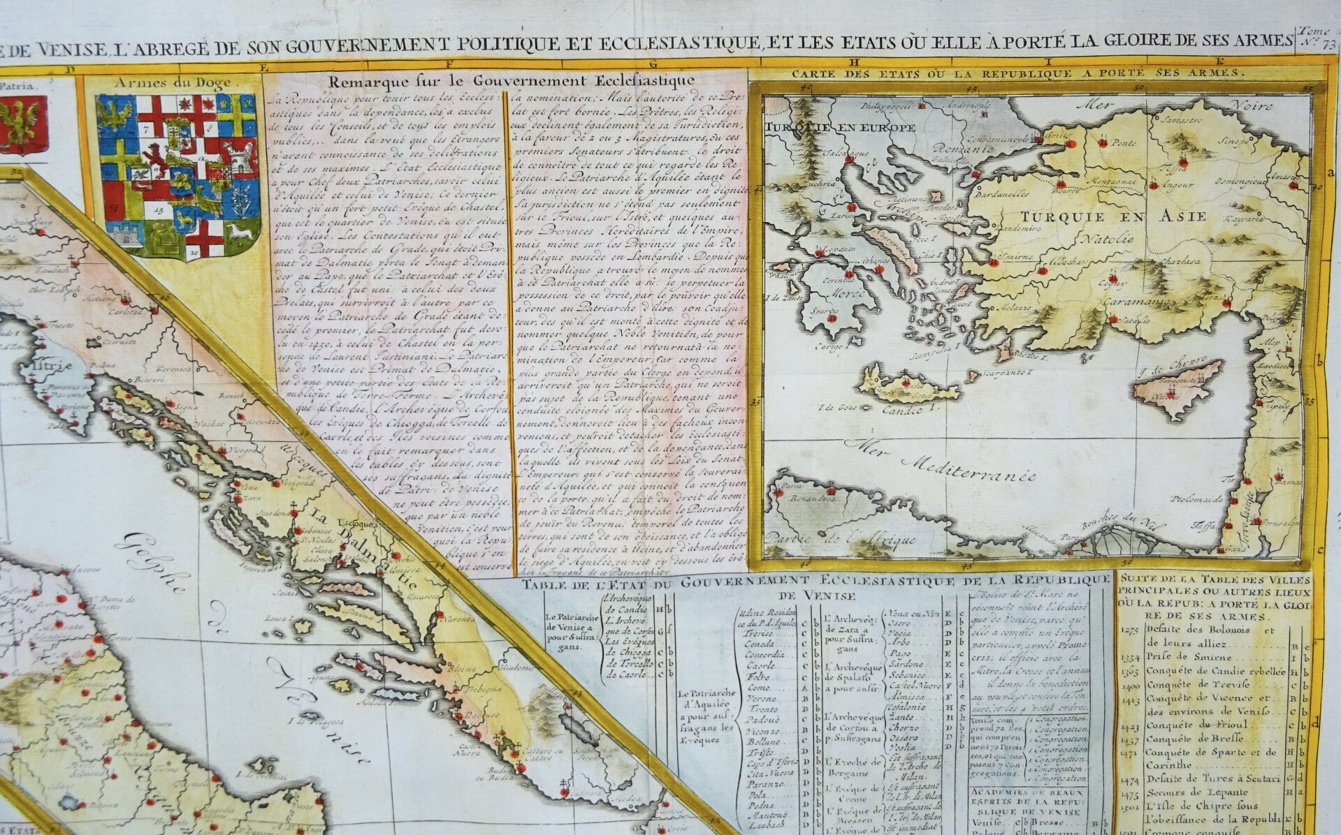 This handsome folio sheet presents multiple maps, coats of arms and extensive information on the Republic of Venice and the Adriatic Sea, Greece etcetera.