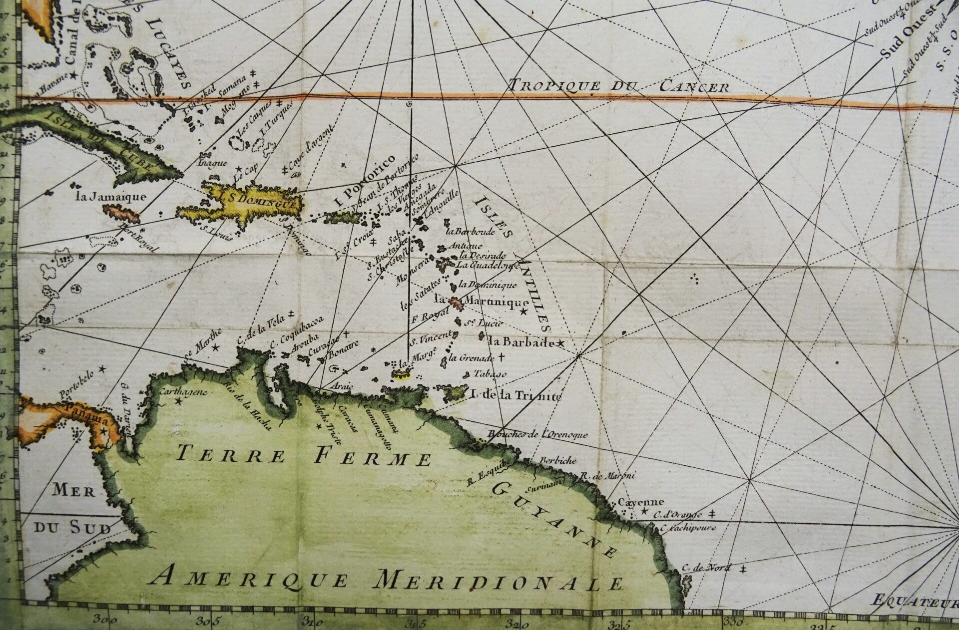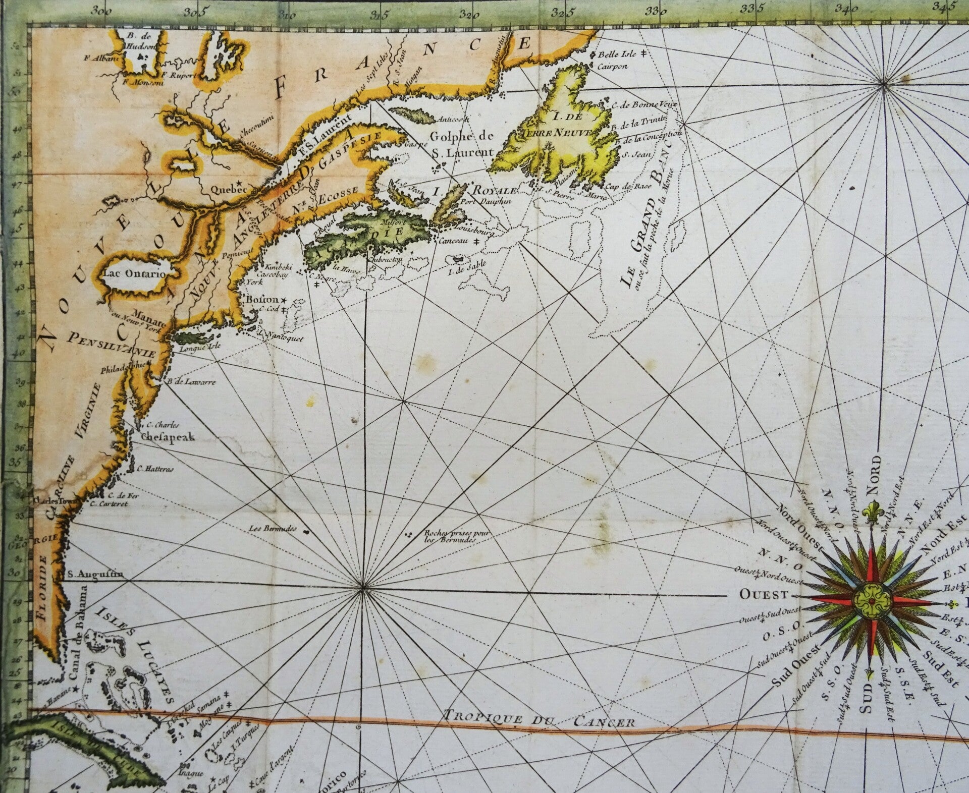 A chart by J.N. Bellin of the northern part of the Atlantic Ocean Europe and West Africa on the right hand side, and the north of South America, the Caribbean Sea and the East Coast of the US and Canada on the left.